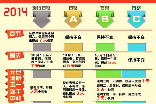 假日辦征求對假期意見,三種方案拿出來征求民意,用哪個都會招來吐沫。其實這也不是眾口難調(diào),而是管得太寬。一年放多少假,怎么個放法,把公務員給規(guī)定好了就結(jié)了。至于一般群眾想怎么休息,讓大家自行決定不好嗎?有那個絞盡腦汁琢磨挪日子的精力,真不如好好想想怎么落實勞動法,讓大家能踏實休息,踏實帶薪休假,踏實每周40小時工作制。瞧瞧古今中外,哪個國家、哪個朝代,有為放假這么嘬牙花子的么?