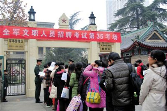 12月15日,在解放軍南京政治學院考點,考生等候進場參加考試。當日,軍隊首次統(tǒng)一招聘文職人員考試舉行,據(jù)解放軍總政治部有關(guān)部門介紹,共有10萬余人報名應聘,報名和錄取比例平均為38∶1。